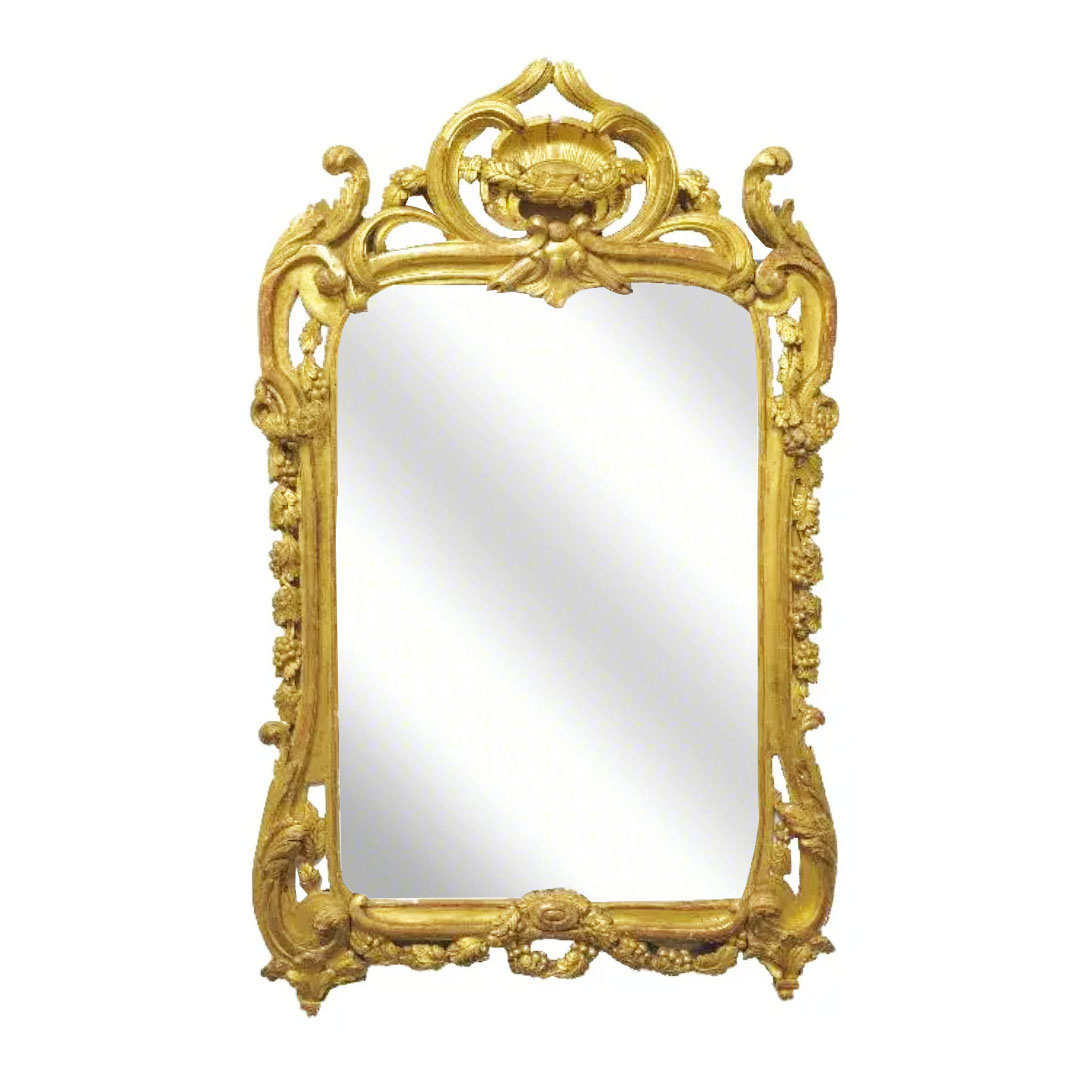 The Louis XV style, characterized by its graceful curves, intricate carvings, and opulent details, beautifully melds with the more structured and neoclassical elements of the Louis XVI style in this transitional mirror.