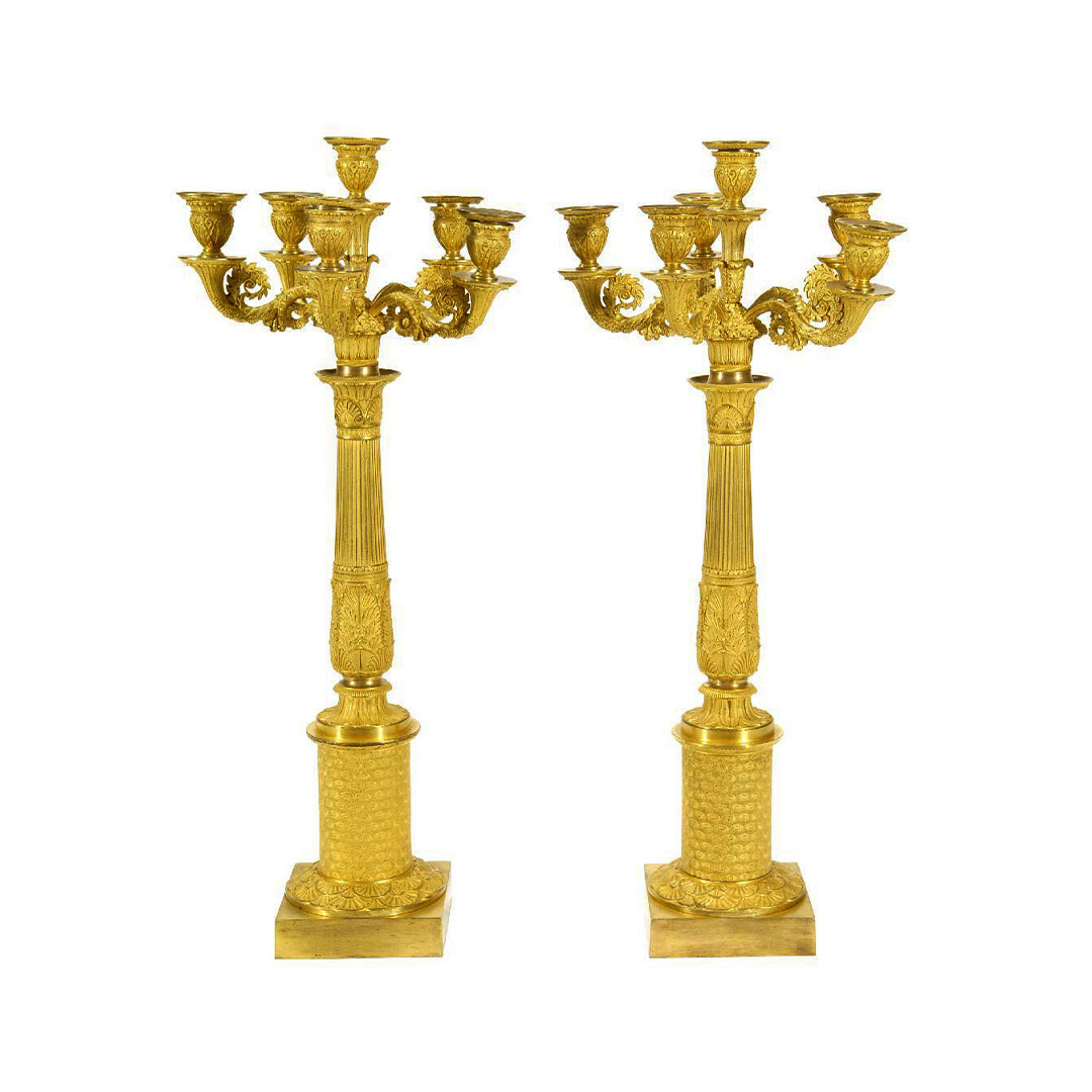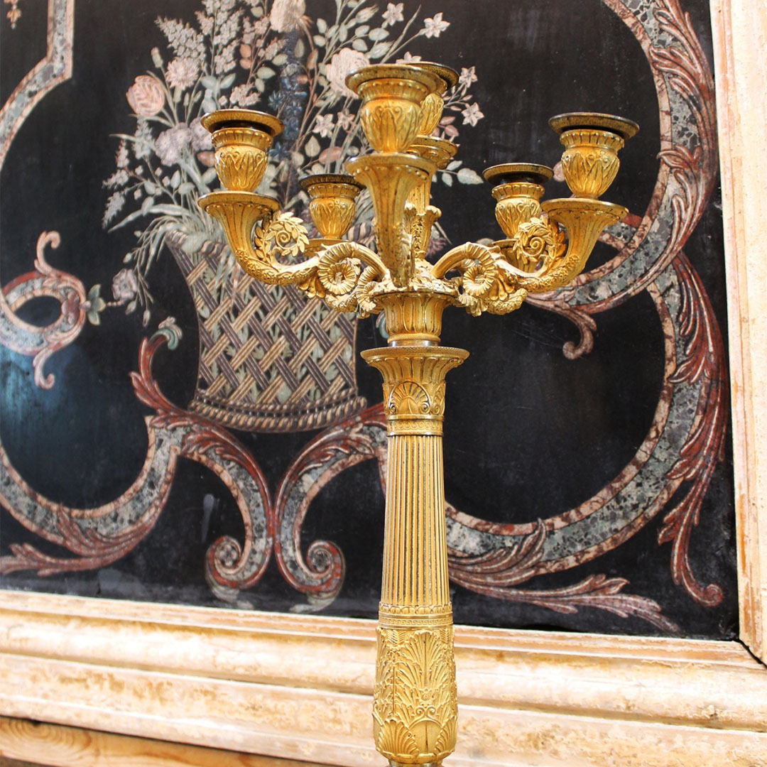 Finished with a beautiful ormolu, these candelabras are a testament to the quality and craftsmanship of the era. Their timeless design and exquisite details make them the perfect addition to any collection of fine antiques, and their ability to add a touch of glamour and elegance to any room ensures they will be cherished for generations to come. Whether used for their original purpose or simply admired for their beauty, these Restoration ormolu five-light candelabras are sure to impress and enchant all who see them.